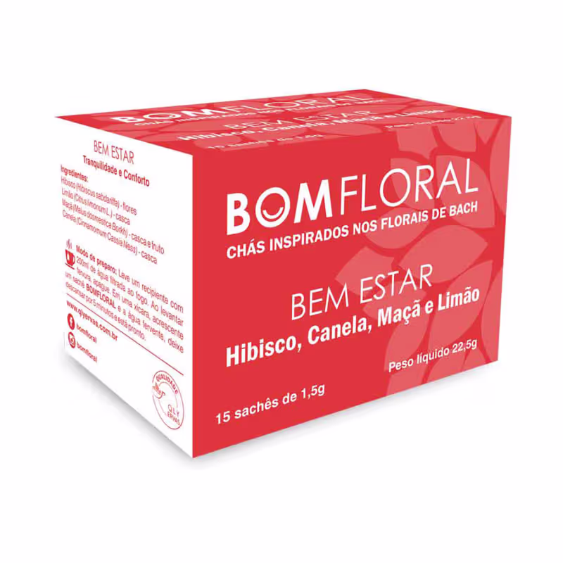 O Chá Natural Bomfloral Bem Estar apresenta um blend especial, com aroma marcante e cor vermelha característica, que transmite conforto e tranquilidade, garantindo que tudo vai dar certo. Com ingredientes como hibisco, canela, maçã e limão, é uma infusão inspirada nas sensações positivas dos Florais de Bach.