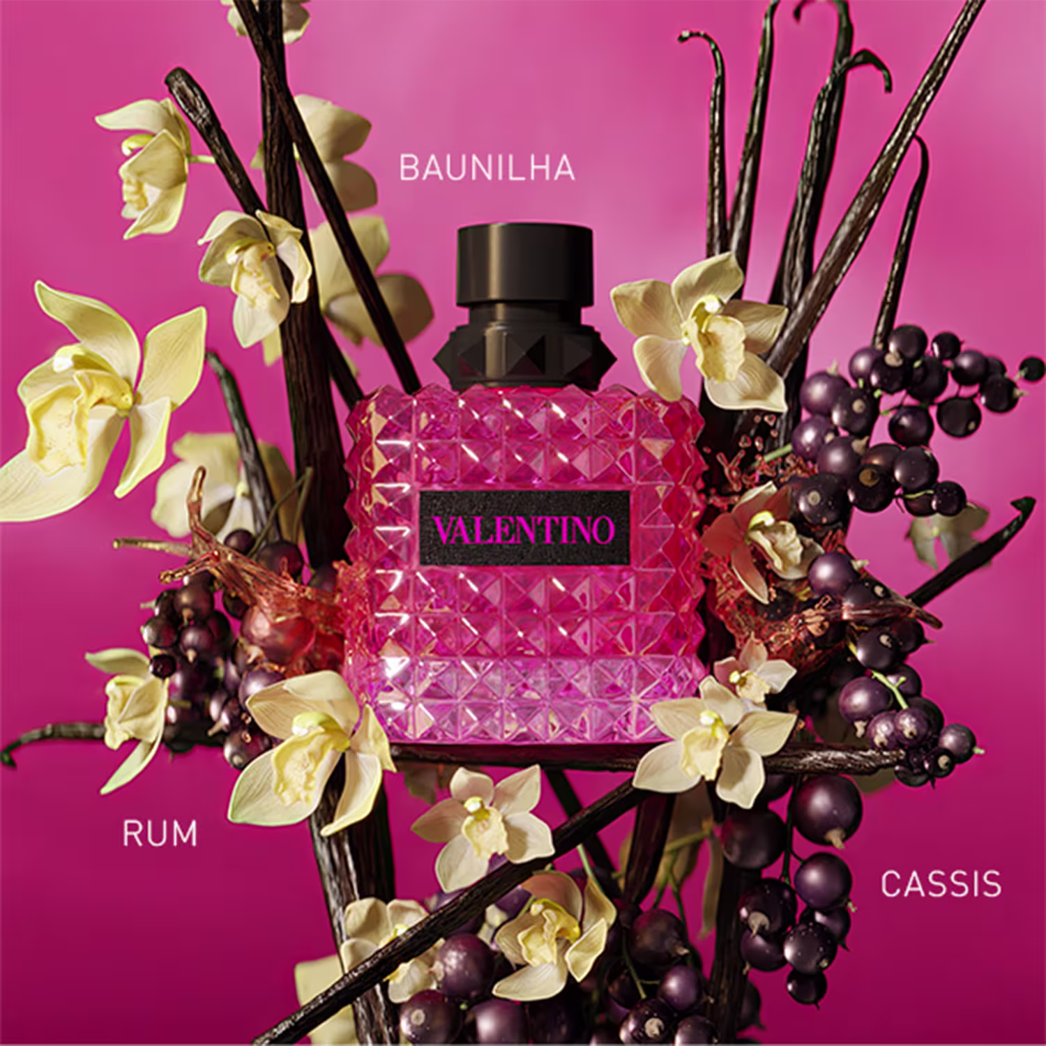O Perfume Born In Roma Donna Extradose, de Valentino, é uma interpretação intensa e vibrante do universo Valentino, trazendo a mais alta concentração da linha para uma experiência profundamente envolvente. A fragrância combina um acorde ousado de cassis nas notas de topo, um coração marcado por um rum concentrado de efeito licoroso e extremamente feminino, e uma base quente e viciante de baunilha ampliada, que confere assinatura doce, marcante e sedutora. O frasco mantém o icônico design Rockstud, inspirado na arquitetura romana, reforçando o caráter moderno, sofisticado e audacioso da Maison.