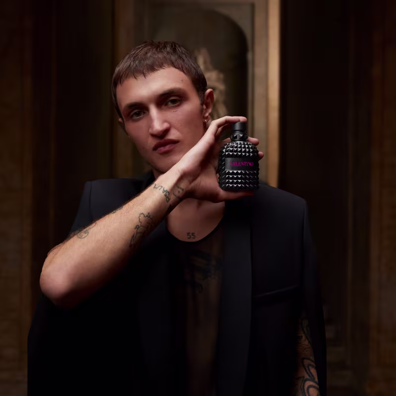 No fundo, o vetiver altamente concentrado se une à madeira de guaiaco, revelando facetas quentes, amadeiradas e levemente cuir, tornando-o perfeito para dias mais frios. O frasco mantém o design piramidal inspirado no icônico Valentino Rockstud, refletindo força, atitude e a essência da Maison.