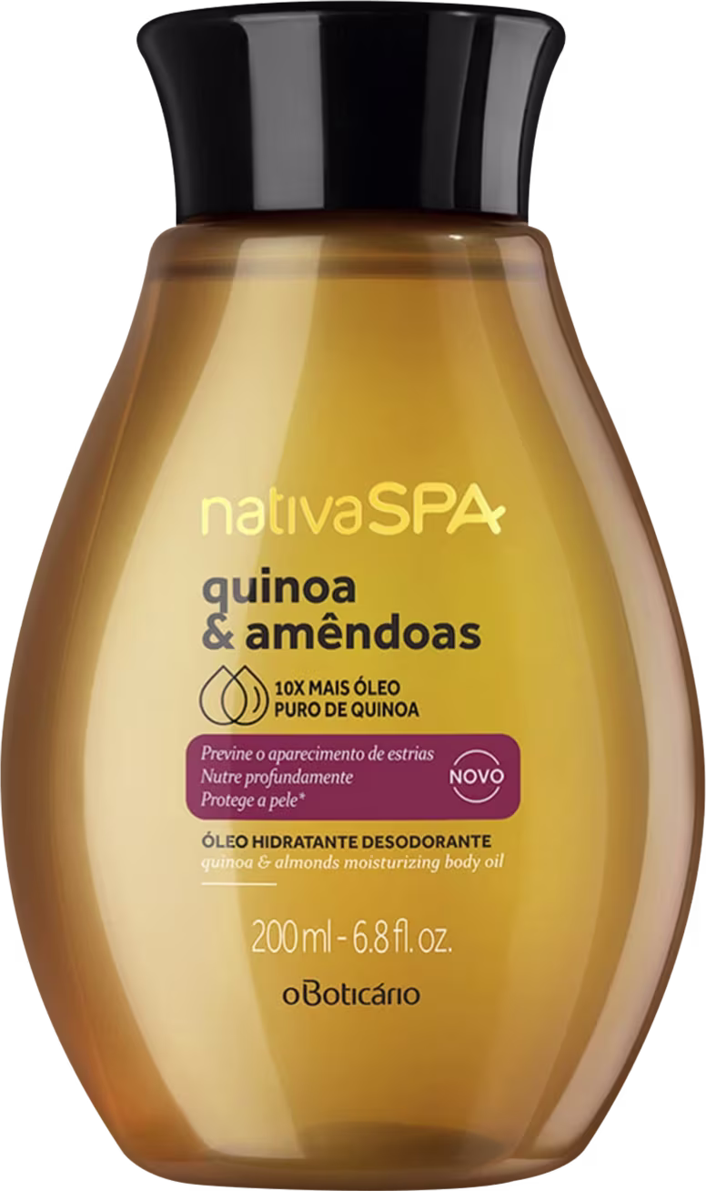 Óleo hidratante desodorante corporal. o Boticário Nativa SPA Quinoa & Amêndoas proporciona hidratação intensa e nutrição, além de prevenir estrias.