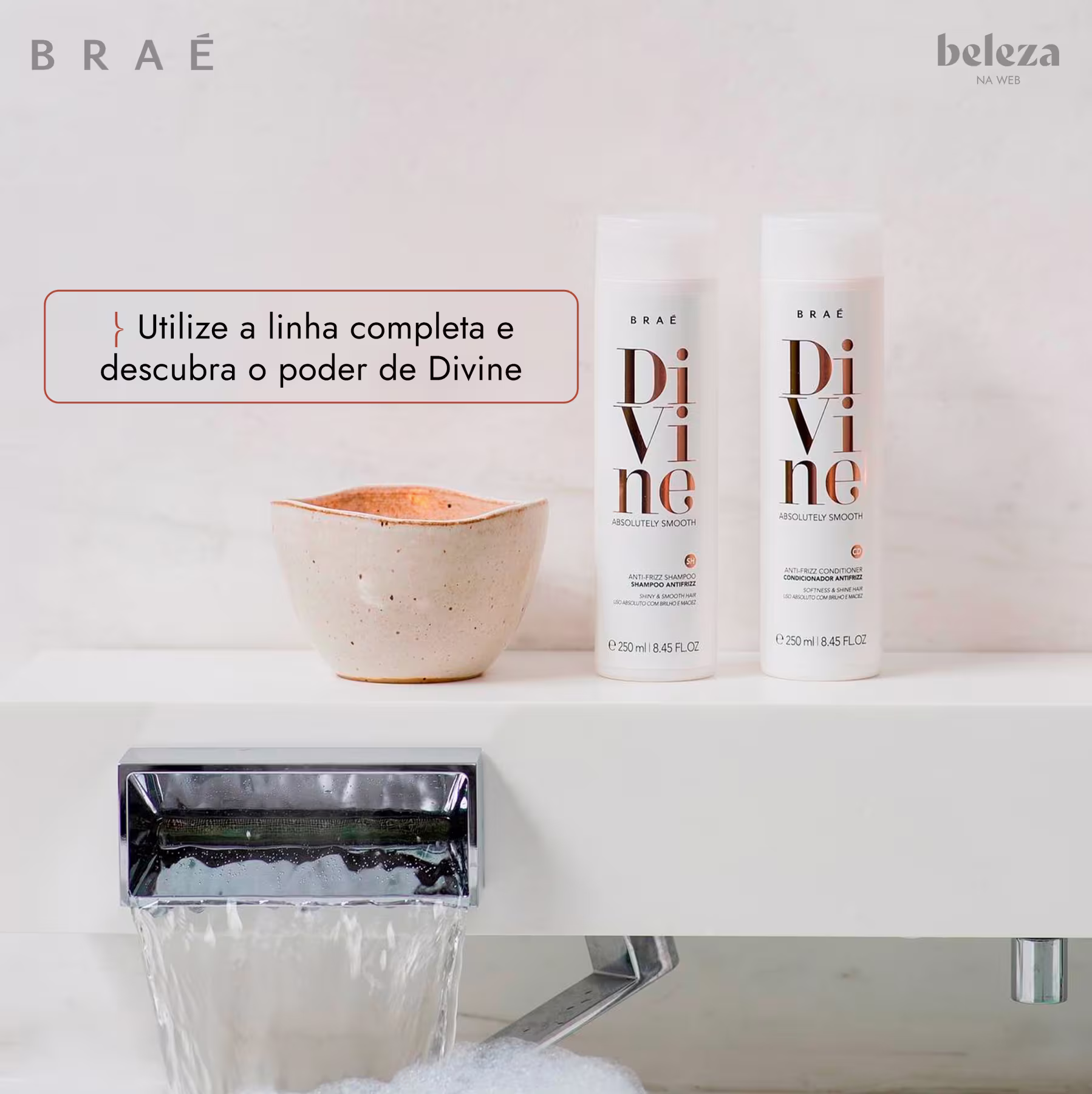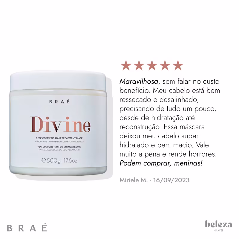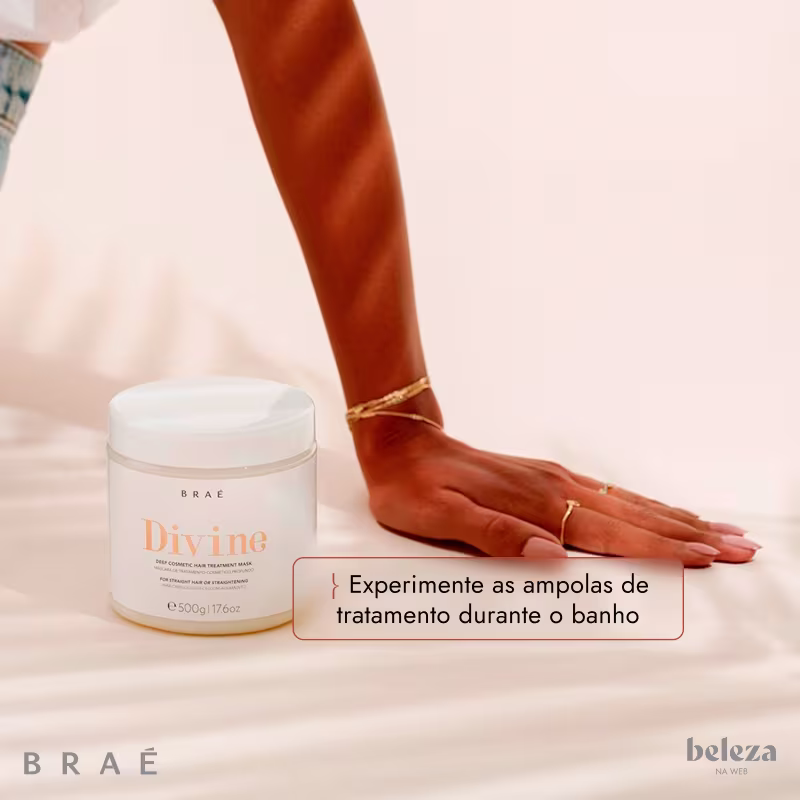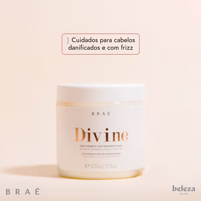 Máscara de tratamento para cabelos danificados e com frizz. Braé Divine nutre intensamente, restaura e alinha.