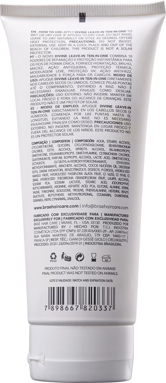 O Leave-in Braé Divine Ten in One proporciona hidratação, ação antifrizz, força, proteção térmica, maciez, brilho, proteção UV, ação antiquebra e maleabilidade. Além disso, garante uma modelagem leve nos fios. Com ele, seu cabelo fica revitalizado e nutrido.