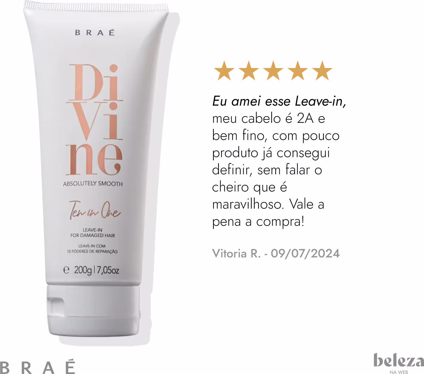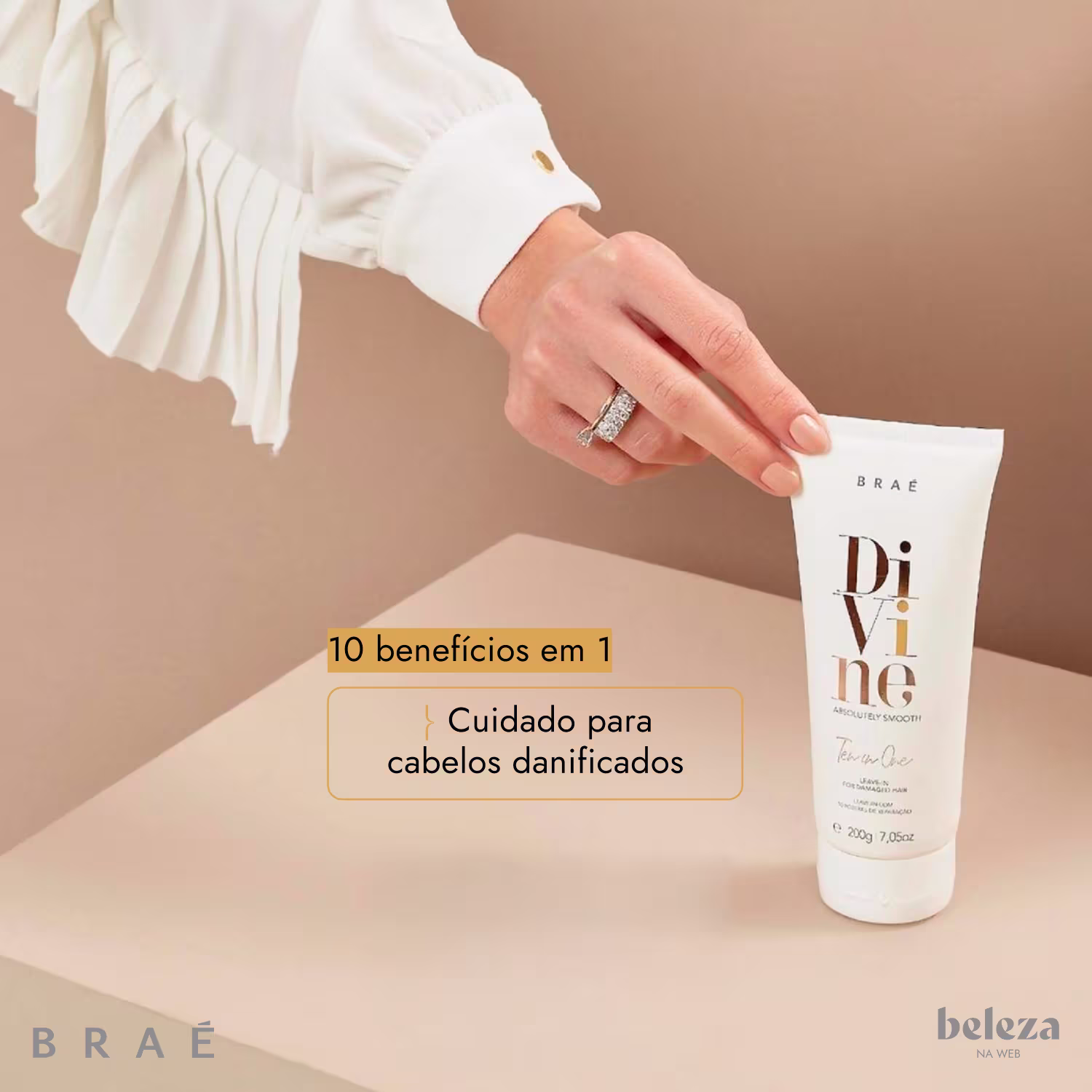 Leave-in para cabelos danificados. Braé Divine Ten in One apresenta 10 benefícios de reparação em um único produto.