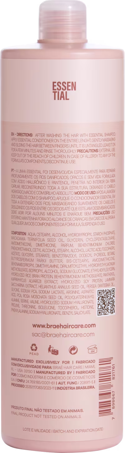O Condicionador Braé Essential possui ação reparadora imediata dos fios fragilizados. Sua fórmula é enriquecida com ativos que fortalecem o cabelo, devolvendo a saúde, beleza e maciez.