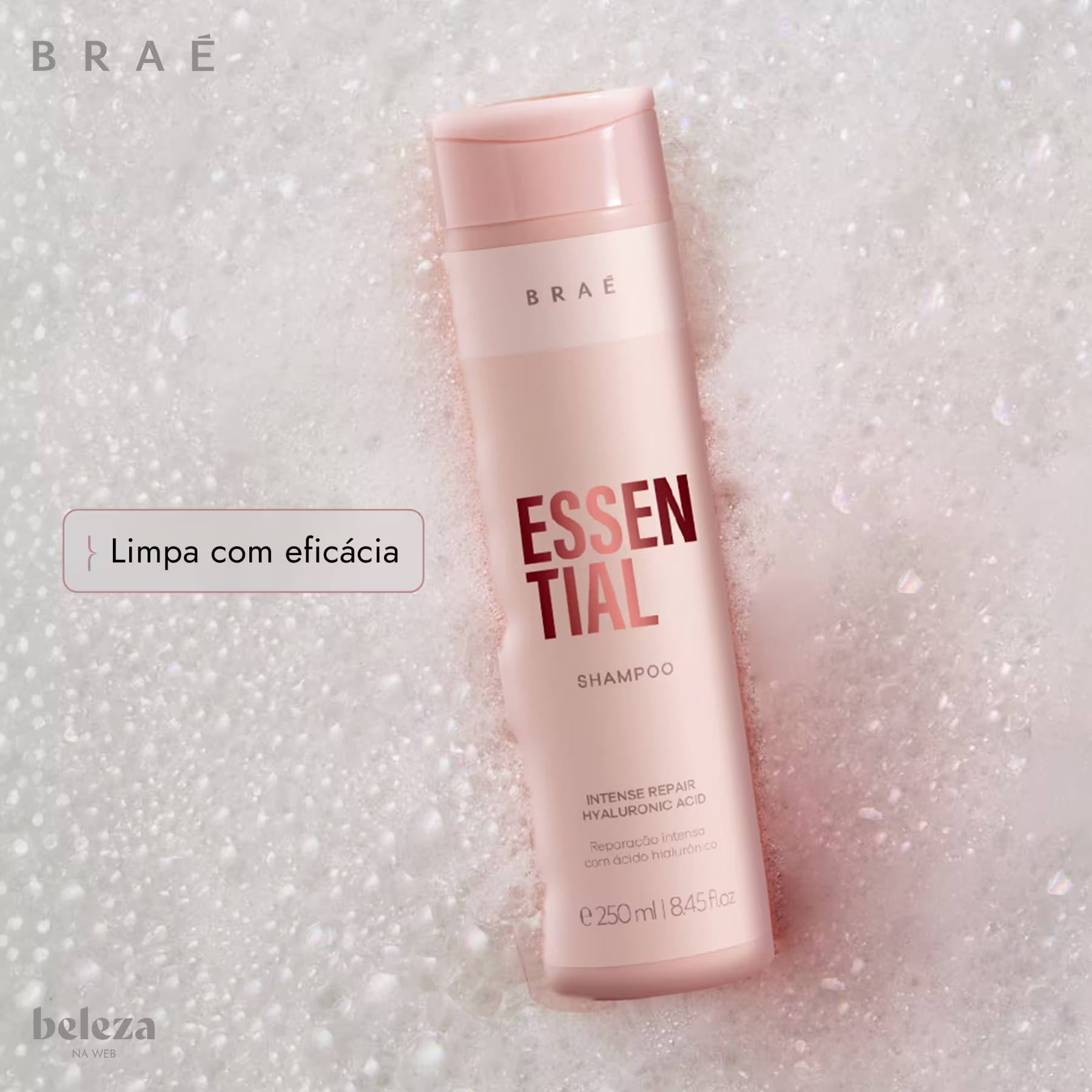 Shampoo para cabelos danificados. Braé Essential proporciona reparação, hidratando e protegendo progressivamente os fios.