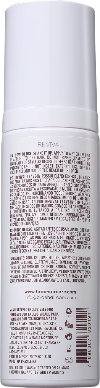 Leave-in reconstrutor para cabelos danificados e fragilizados. Braé Revival Leave-in Reconstrutor facilita a pentear, nutre e repara os fios de acordo com sua necessidade.