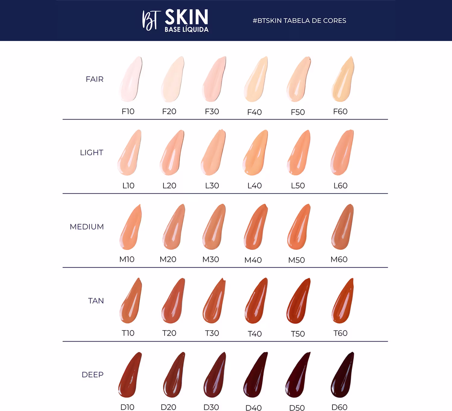 A Base Bruna Tavares BT Skin possui textura ultrafluida e cobertura leve a média com incrível acabamento de “segunda pele”, permitindo a construção de camadas, sem pesar. Sua fórmula atua como tratamento antissinais, proporcionando mais firmeza e elasticidade para a pele.