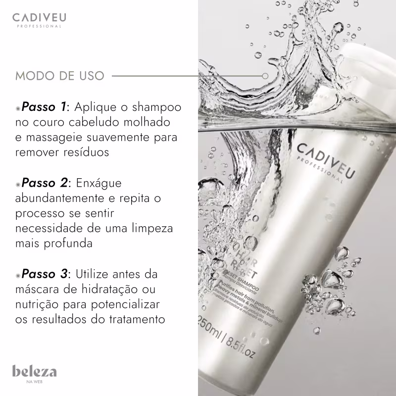 O Shampoo Cadiveu Hair Reset promove uma limpeza técnica e eficiente, ideal para preparar os fios para tratamentos intensivos. Sua fórmula remove impurezas profundas sem interferir em procedimentos químicos já realizados. Ao eliminar resíduos e calcário, devolve o movimento natural e reduz o frizz. O couro cabeludo fica equilibrado e os fios mais receptivos aos ativos de tratamento.