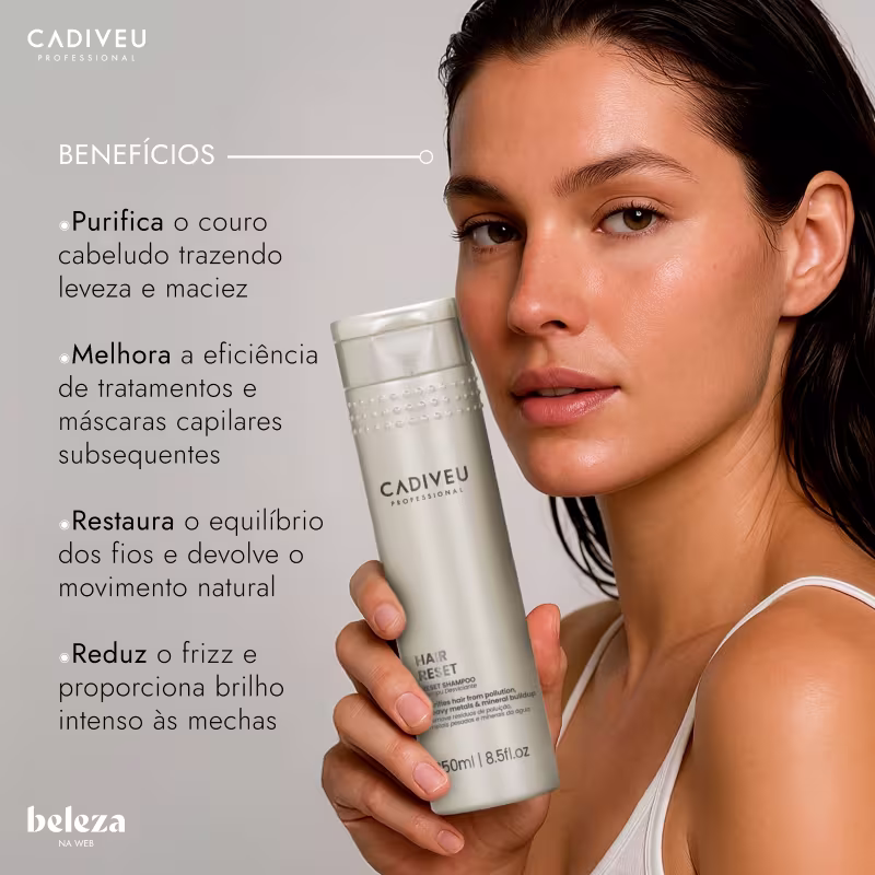 Shampoo para cabelos com resíduos cosméticos em excesso. Cadiveu Hair Reset purifica o couro cabeludo, trazendo leveza e maciez.
