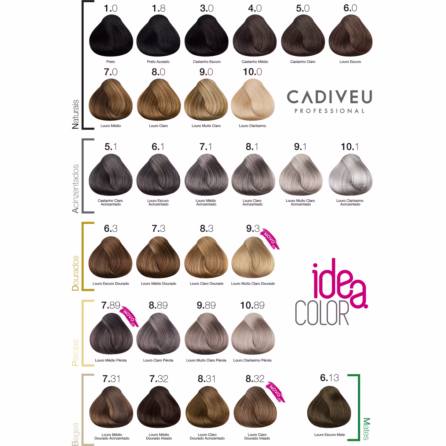 Coloração permanente. Cadiveu Idea Color proporciona cobertura completa dos cabelos brancos, com cor vibrante, resistente ao desbotamento e durabilidade prolongada.