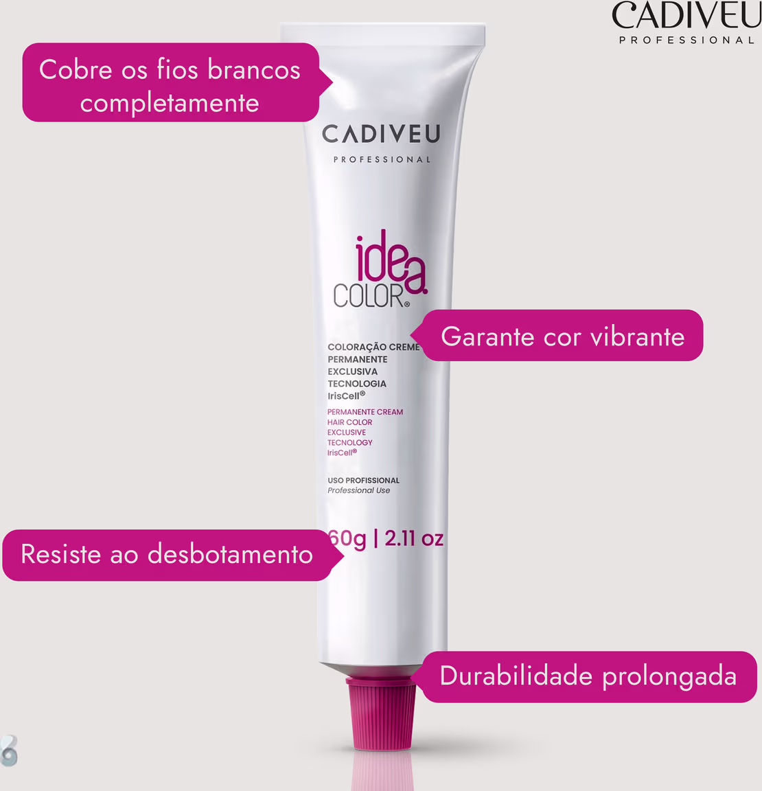 Coloração permanente. Cadiveu Idea Color proporciona cobertura completa dos cabelos brancos, com cor vibrante, resistente ao desbotamento e durabilidade prolongada.