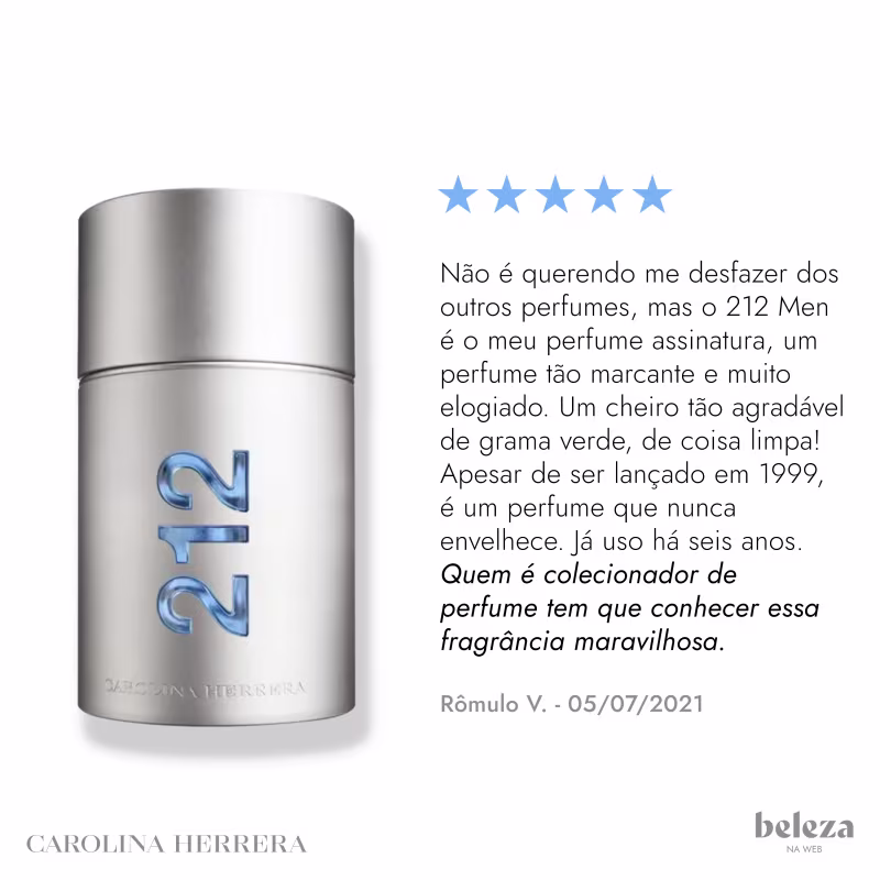 Carolina Herrera entrega uma versão do perfume 212 masculino com notas frescas de Verde Energético equilibradas com Especiarias sensuais e apimentadas, Sândalo Quente e Madeira do Guáiaco.
