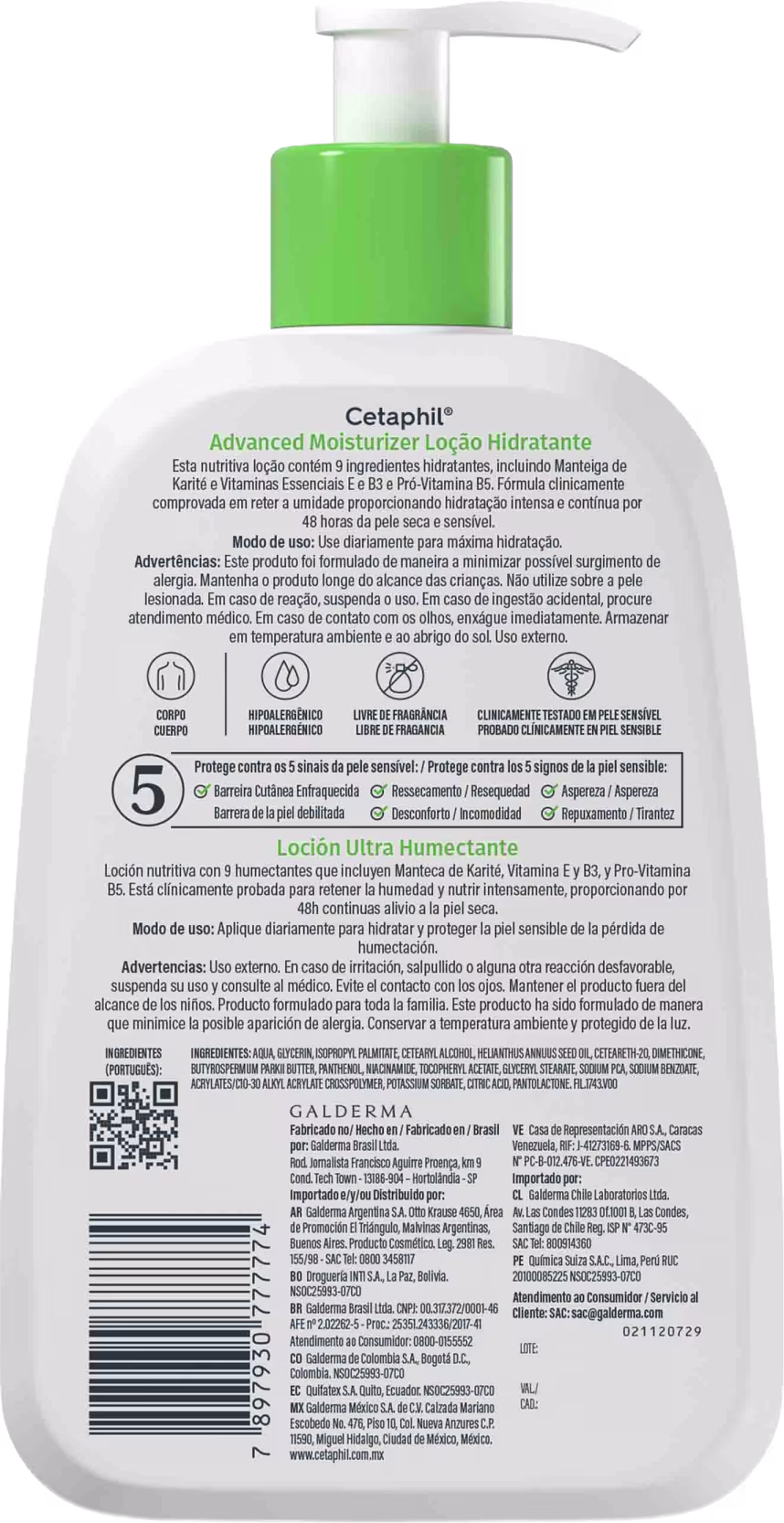 A Loção Hidratante Cetaphil Advanced foi desenvolvida especialmente para a redução imediata da aspereza da pele enquanto nutre e restaura intensamente a pele. Clinicamente testado para acelerar o reparo da barreira cutânea danificada em 1 semana.