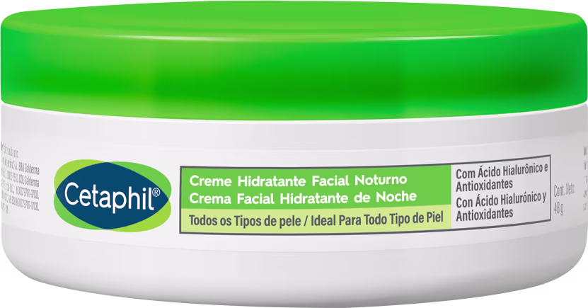 Creme hidratante facial noturno para todos os tipos de pele. Cetaphil com Ácido Hialurônico hidrata, nutre e suaviza a pele, prevenindo o envelhecimento.