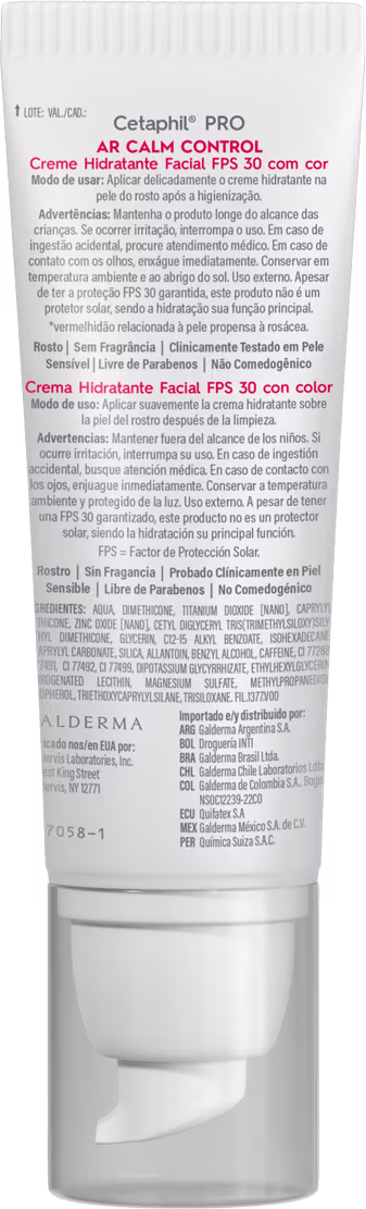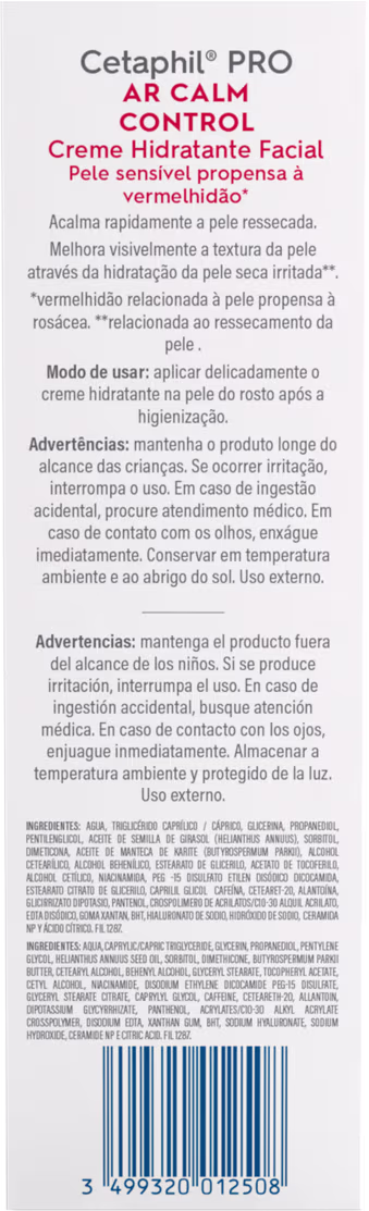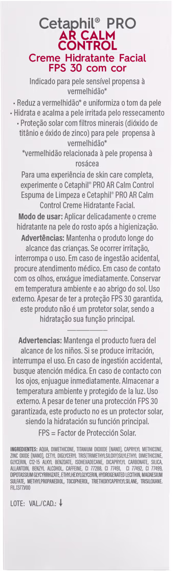 O Creme Hidratante Facial Cetaphil Pro AR Calm Control FPS 30 foi desenvolvido e testado por especialista em busca de uma formulação que hidratasse, reduzisse a vermelhidão e uniformizasse o tom da pele. Seus ativos auxiliam no cuidado de peles com tendência à rosácea além de oferecer proteção UVA/UVB, cuidando e protegendo contra os danos causados pela exposição solar.