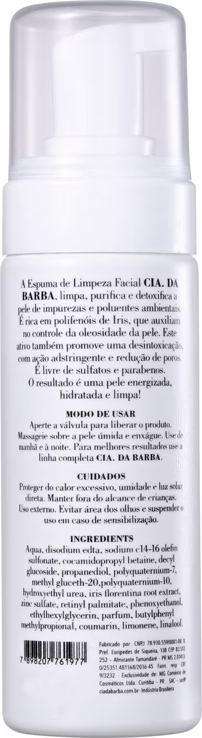Cia. da Barba Limpeza Facial Espuma Purificante Detox foi desenvolvida especialmente para a higienização da pele masculina, essa espuma remove as impurezas do rosto, resíduos de poluição e o excesso de oleosidade, sem ressecá-lo ou desidratá-lo.