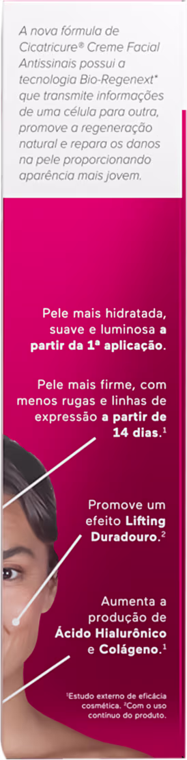O Creme Cicatricure Antissinais traz em sua fórmula a exclusiva tecnologia Bio-Regenerex, que repara os danos causados pelo tempo e garante uma aparência mais jovem desde a primeira aplicação, recuperando 2 anos de danos em 2 meses. Traz também diversos ativos altamente hidratantes, que confere uma aparência mais saudável e toque macio à pele. Sinta sua pele mais macia, rejuvenescida e luminosa.