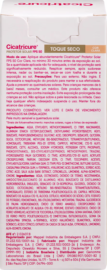 O Protetor Solar Facial com Cor Cicatricure Antissinais FPS50 é ideal para uso diário e auxilia na prevenção dos sinais de envelhecimento relacionados à exposição solar, como marcas solares, rugas e linhas de expressão. Sua tecnologia foi desenvolvida para proporcionar uma alta proteção contra os raios UVA e UVB, graças à sua fórmula com Ácido Hialurônico e Pró-Colágeno. Ele também é dermatologicamente testado e resistente à água e ao suor. E por ter cor, oferece cobertura natural das imperfeições da pele, com um toque seco e efeito matte instantâneo.