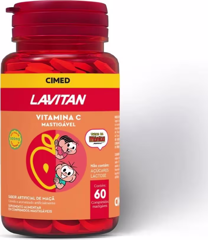 Suplemento mastigável. Cimed Lavitan Vitamina C Sabor Maçã desenvolvido para apoiar o sistema imunológico e promover o bem-estar geral, com foco na suplementação de Vitamina C em uma apresentação prática e saborosa.
