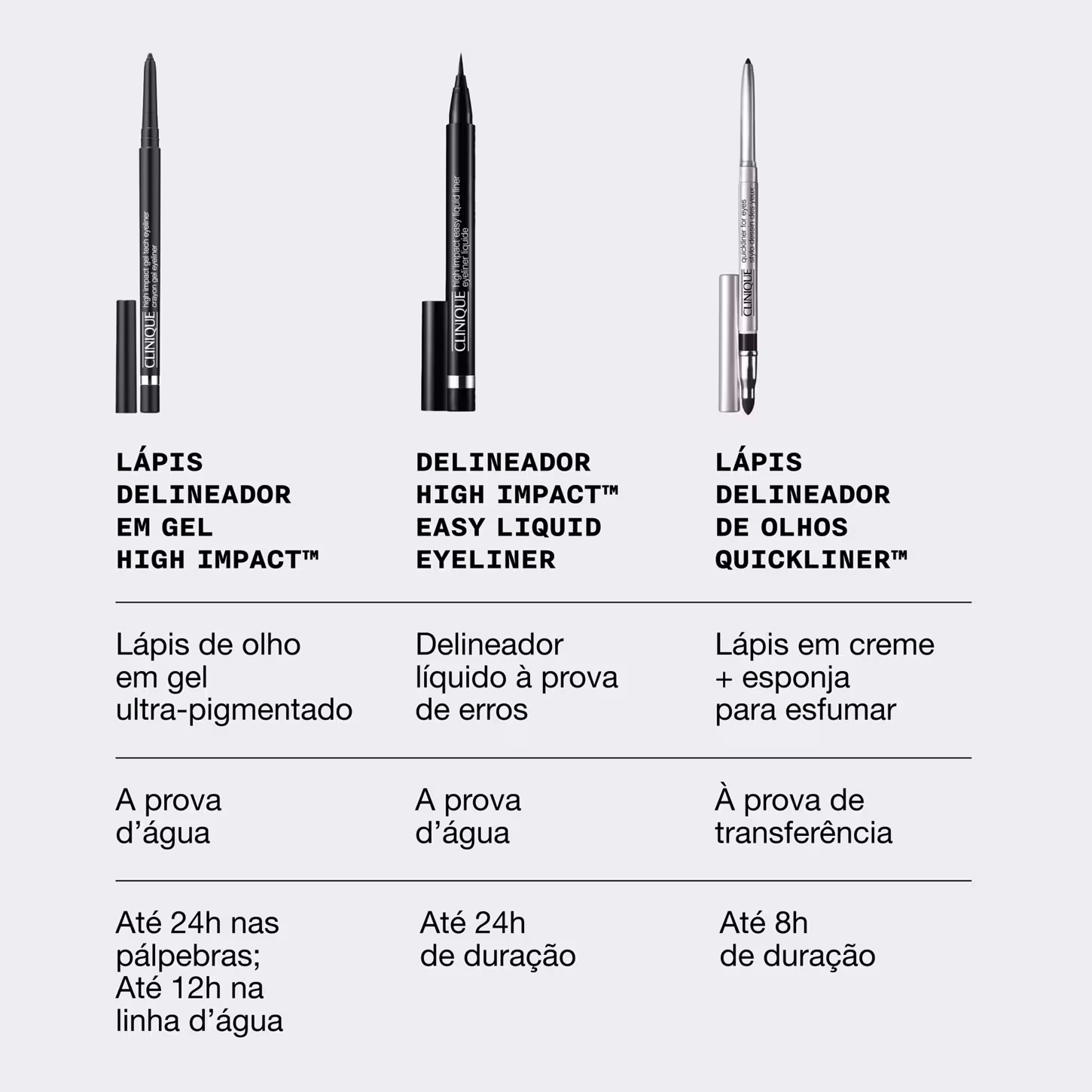 Não sei o CEPLápis para olhos. Clinique High Impact™ Gel Tech Eyeliner promove destaque ao olhar com 24hrs de duração sobre as pálpebras e 12hrs na linha d'agua.