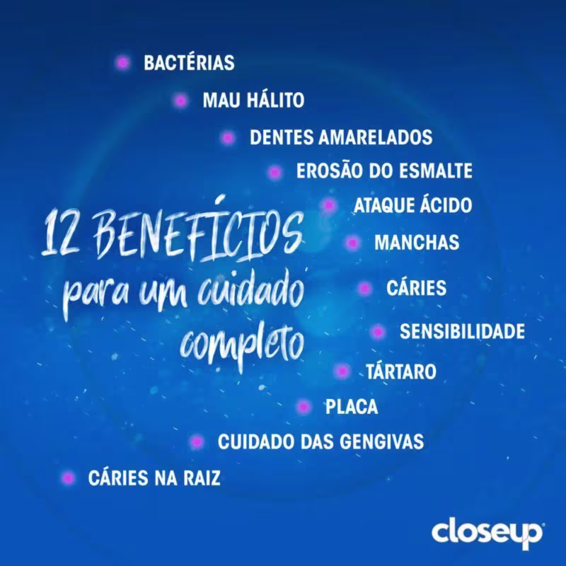 Creme dental. Close Up Multivitaminas +12 Benefícios Branqueador garante até 18 horas de proteção completa contra bactérias, mau hálito, dentes amarelados, erosão do esmalte, ataque ácido, manchas, cáries na raiz, cuidado das gengivas, sensibilidade, tártaro e placa.