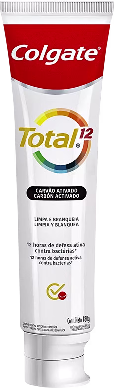 Creme dental. Colgate Total 12 Carvão Ativado proporciona uma limpeza total da boca por 12 horas, além de um sorriso branco e saudável por mais tempo.