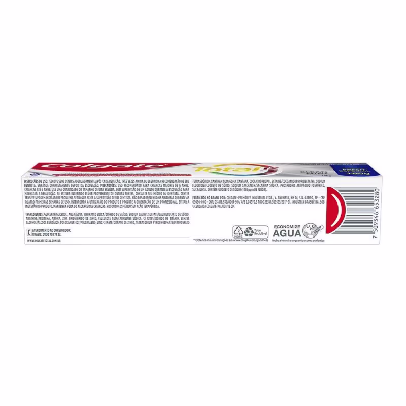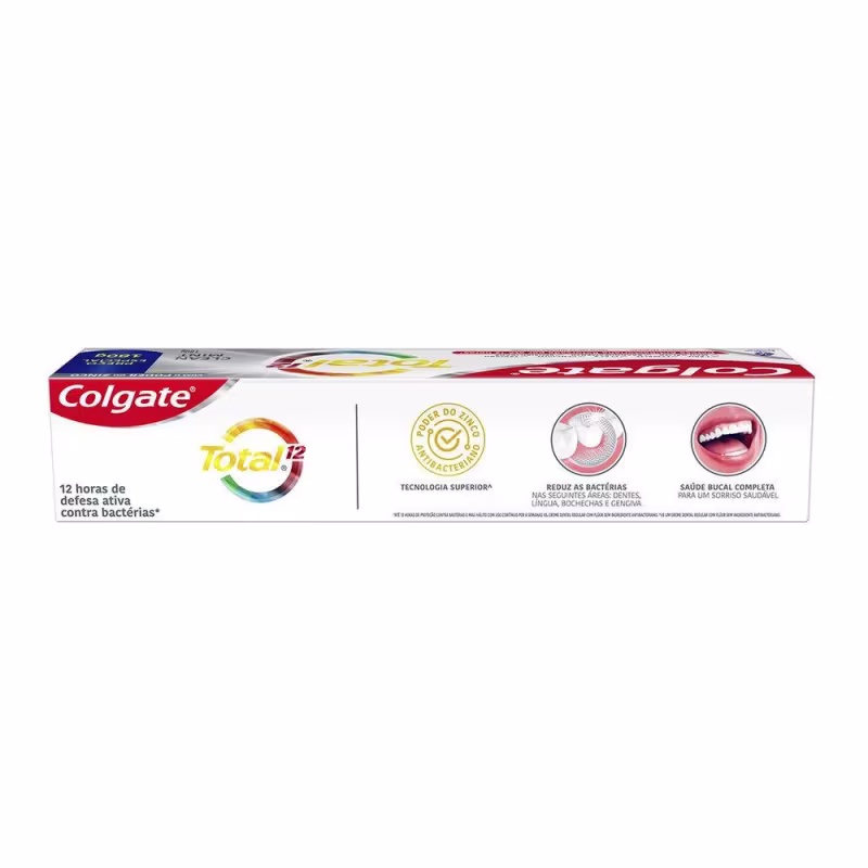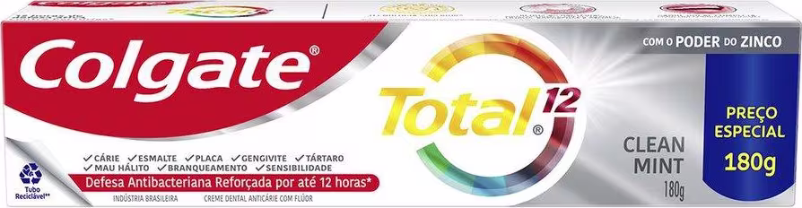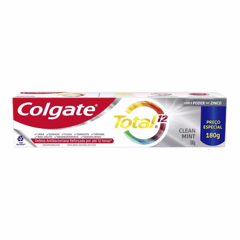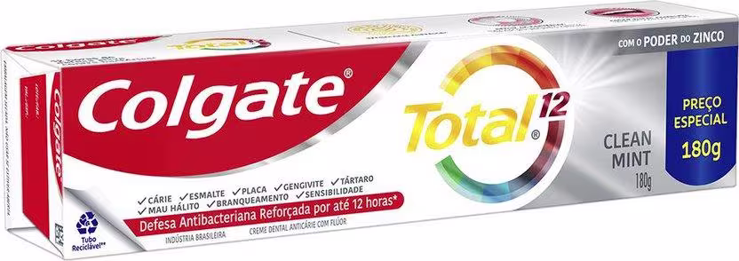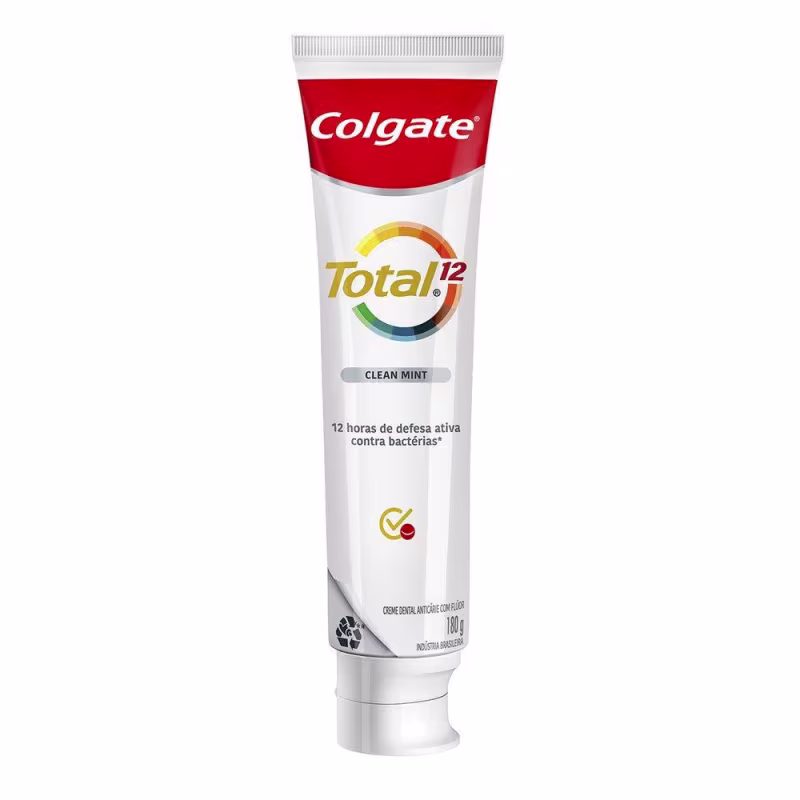 O Creme dental Colgate Total 12 Clean Mint elimina as bactérias causadoras do mau hálito, protege contra a cárie, a formação do tártaro e de placa. Com seu uso contínuo fortalece o esmalte dos dentes, protegendo ainda mais contra possíveis danos.