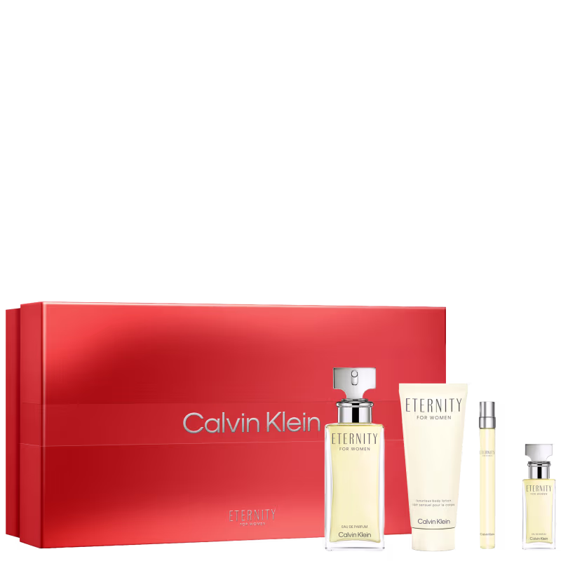 Conjunto feminino com perfume Eternity for Woman floral, body lotion e travel size Calvin Klein. Inspira a sensação autêntica de um amor eterno.