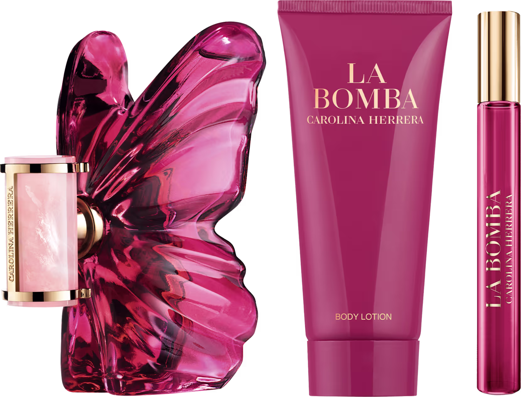 Conjunto feminino com perfumes importados La Bomba florais e loção corporal Carolina Herrera. Uma fragrância sofisticada direcionada para mulheres que valorizam expressão e feminilidade.