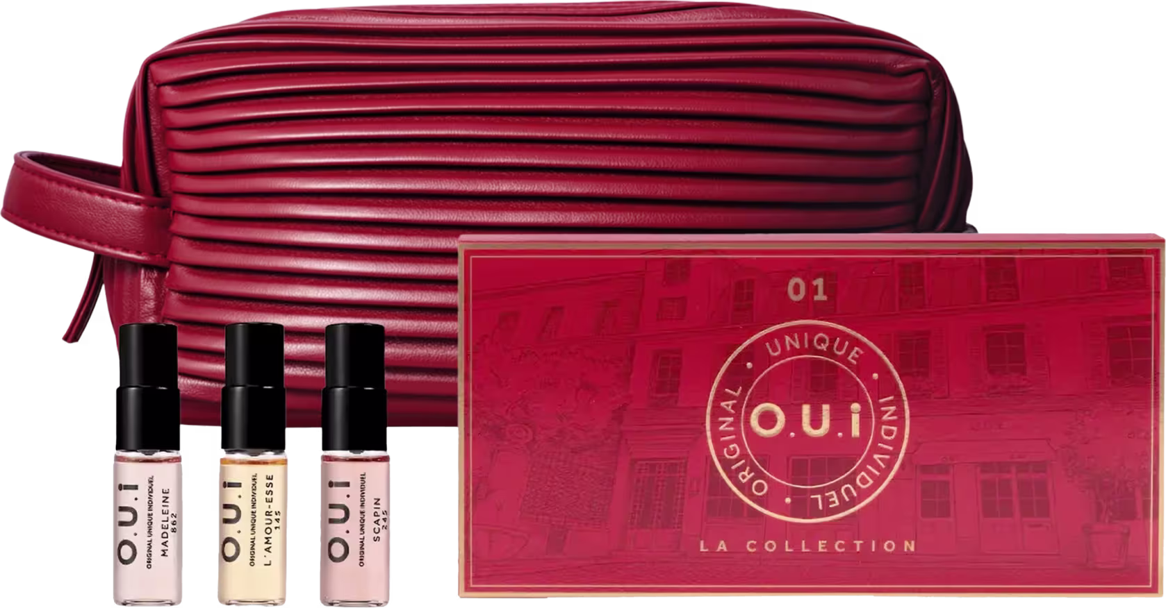 Conjunto com um nécessaire e 3 demonstradores das fragrâncias de La Collection 01, de O.U.i. Inspira a energia feminina.