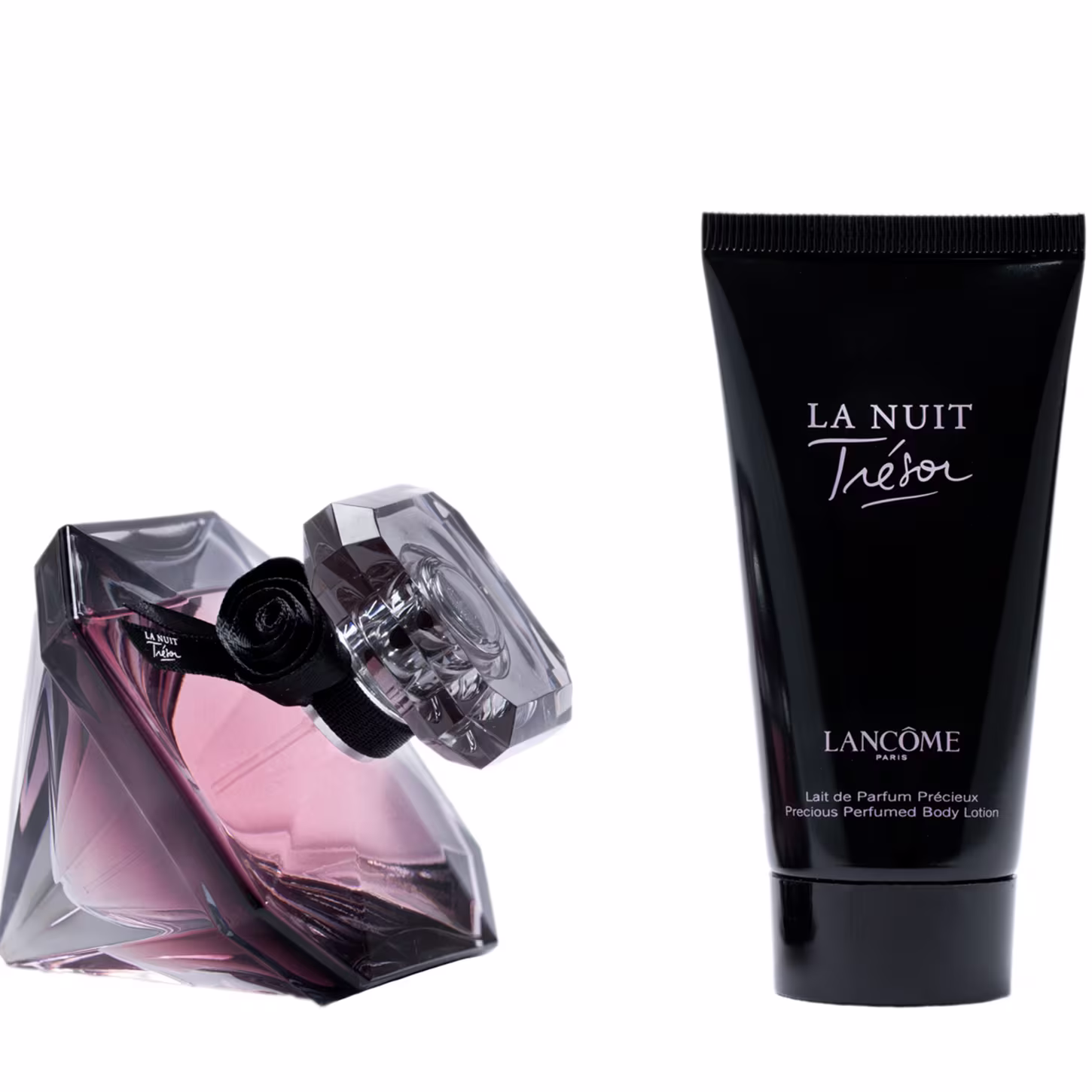 Conjunto feminino com perfume La Nuit Trésor floral oriental e loção corporal Lancôme. Uma irresistível e poderosa poção do amor, ideal para incrementar o look indefectível da mulher que exala paixão à flor da pele.