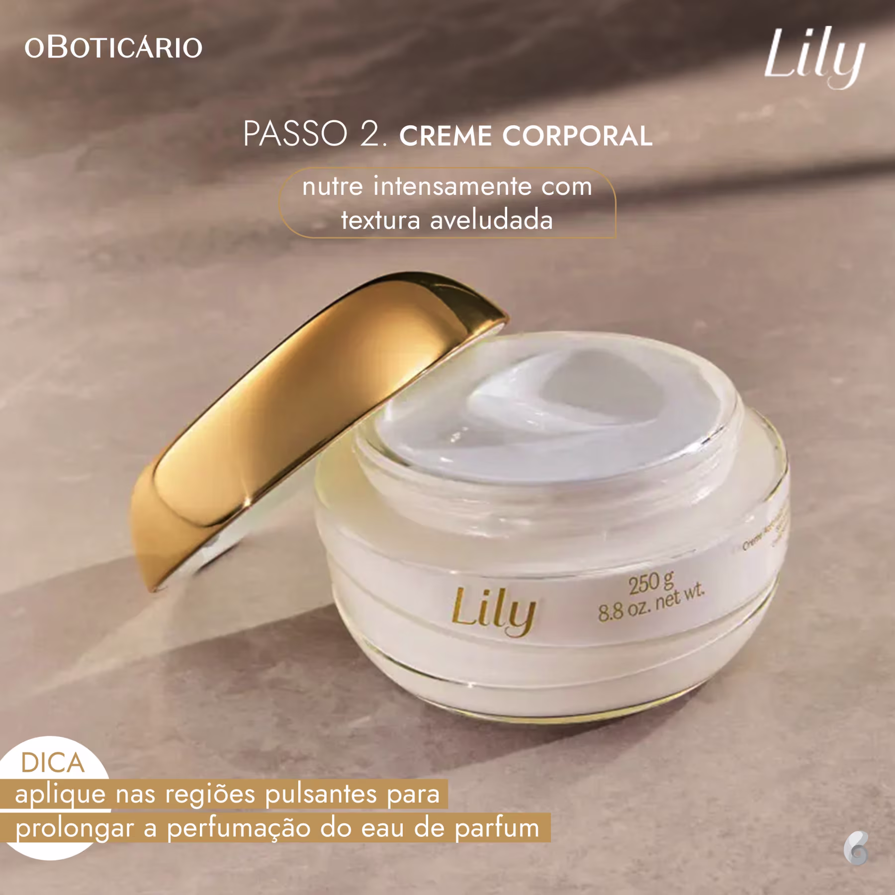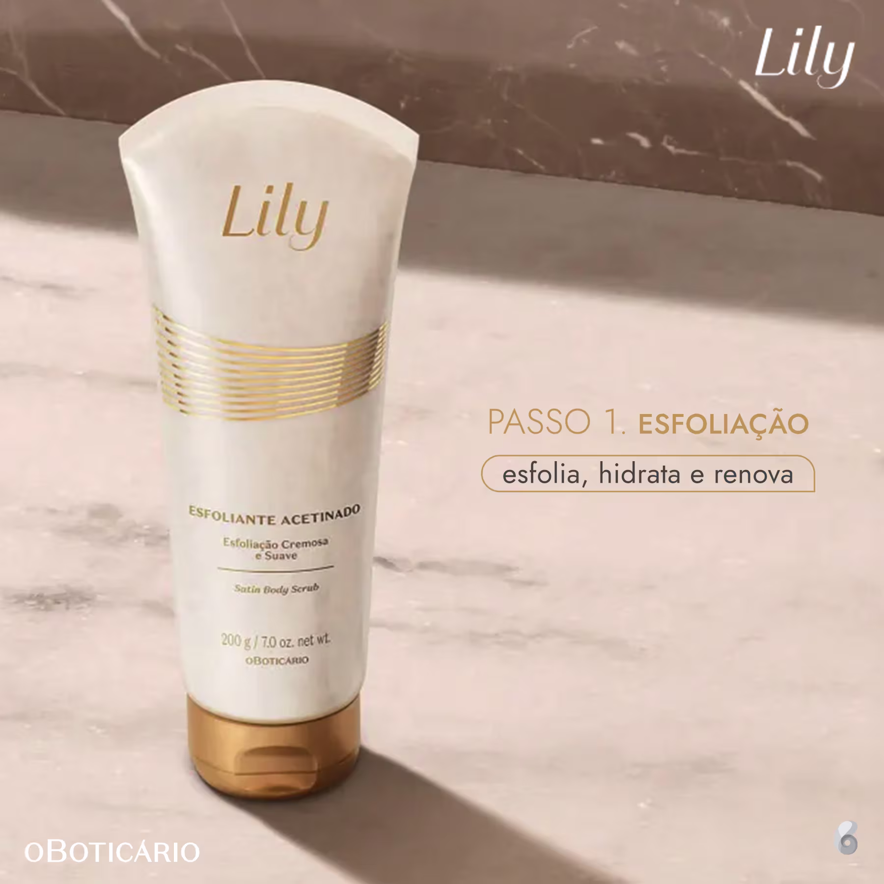 Conjunto feminino com eau de parfum Lily, esfoliante hidratante corporal e creme acetinado hidratante corporal o Boticário. Um combo que traz cuidado, delicadeza e um aroma encantador para as mulheres.