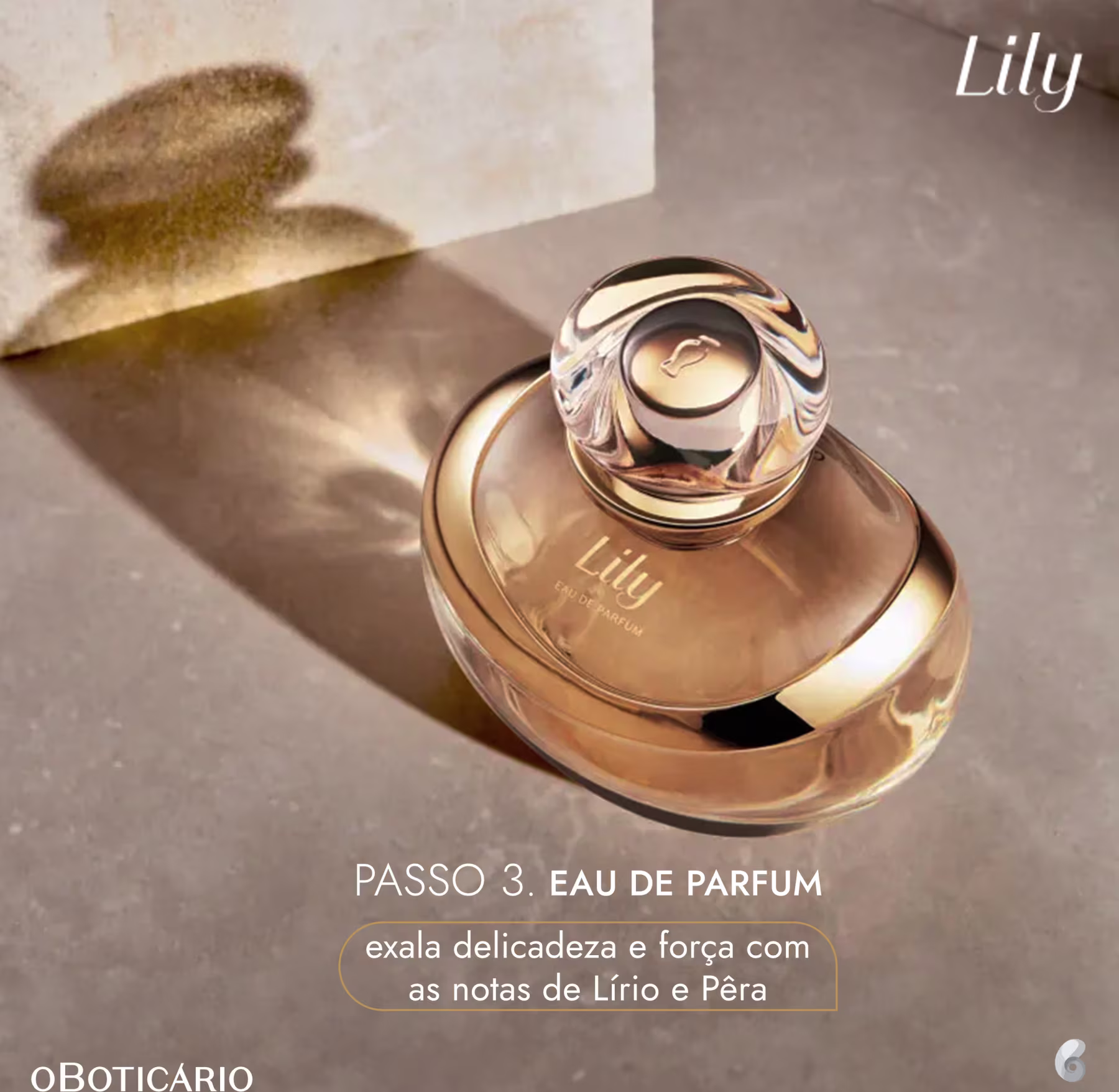 O Eau de Parfum Lily, de o Boticário, traz uma fragrância que combina facetas únicas florais com a força marcante das madeiras, criando assim uma essência sofisticada e proporcionando uma deliciosa experiência olfativa.