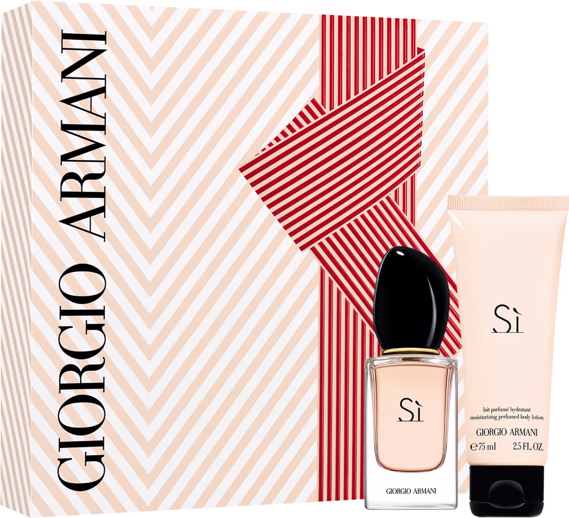 Conjunto com perfume feminino Sí chipre frutal e loção corporal Giorgio Armani. Um aroma intenso que liberta a sensualidade de quem o veste.