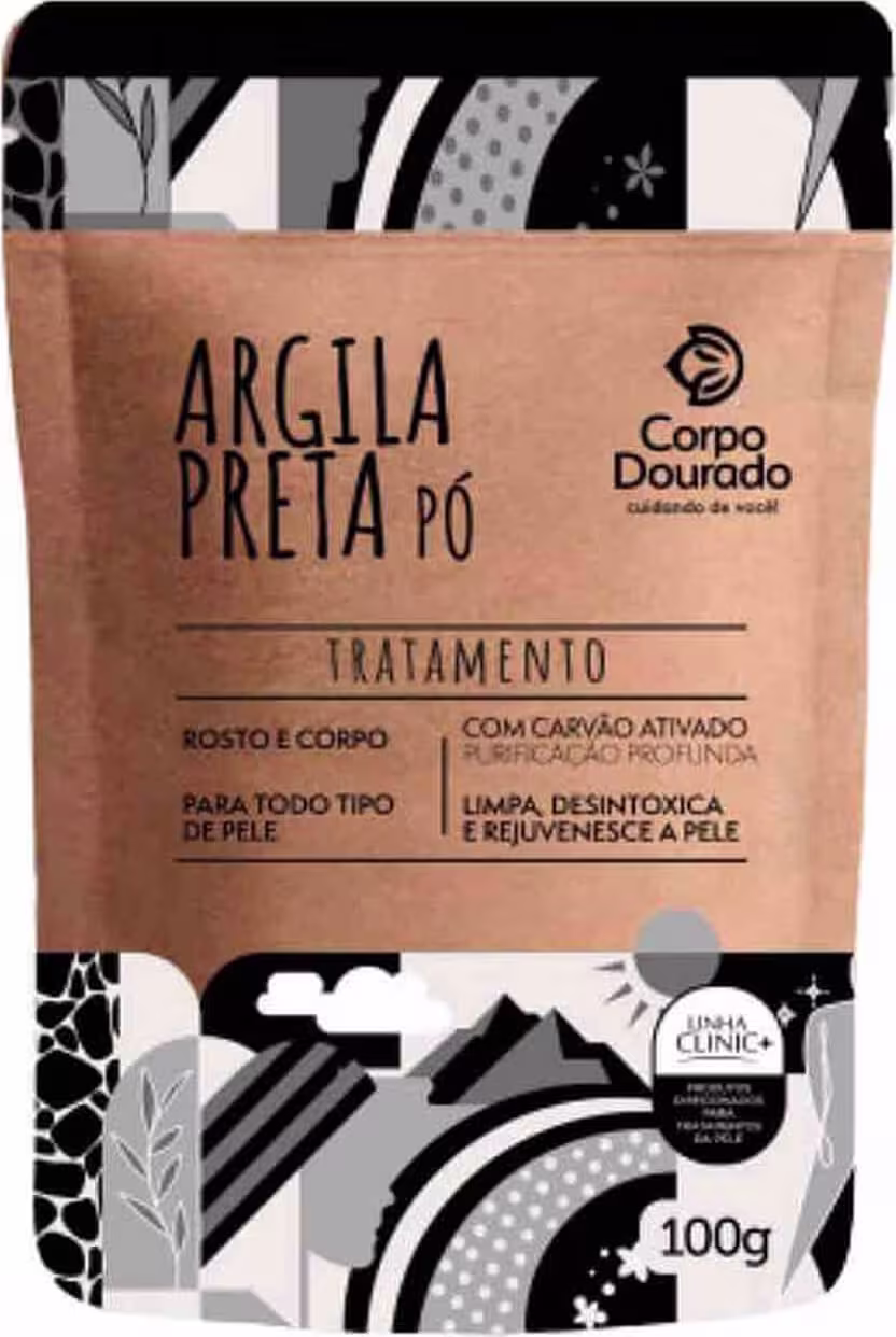 Argila em pó preta para tratamento facial e corporal. Corpo Dourado Clinic Mais ideal para todos os tipos de pele, absorve a oleosidade, removendo impurezas e células mortas.