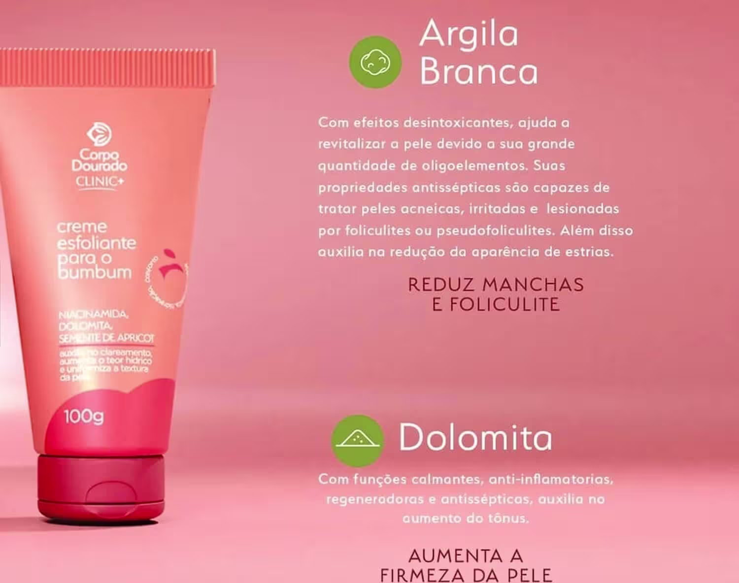 O Creme Esfoliante para o Bumbum Corpo Dourado Clinic Mais traz Niacinamida, Dolomita e Semente de Apricot que auxilia no clareamento, aumenta o teor hídrico e uniformiza a textura da pele.