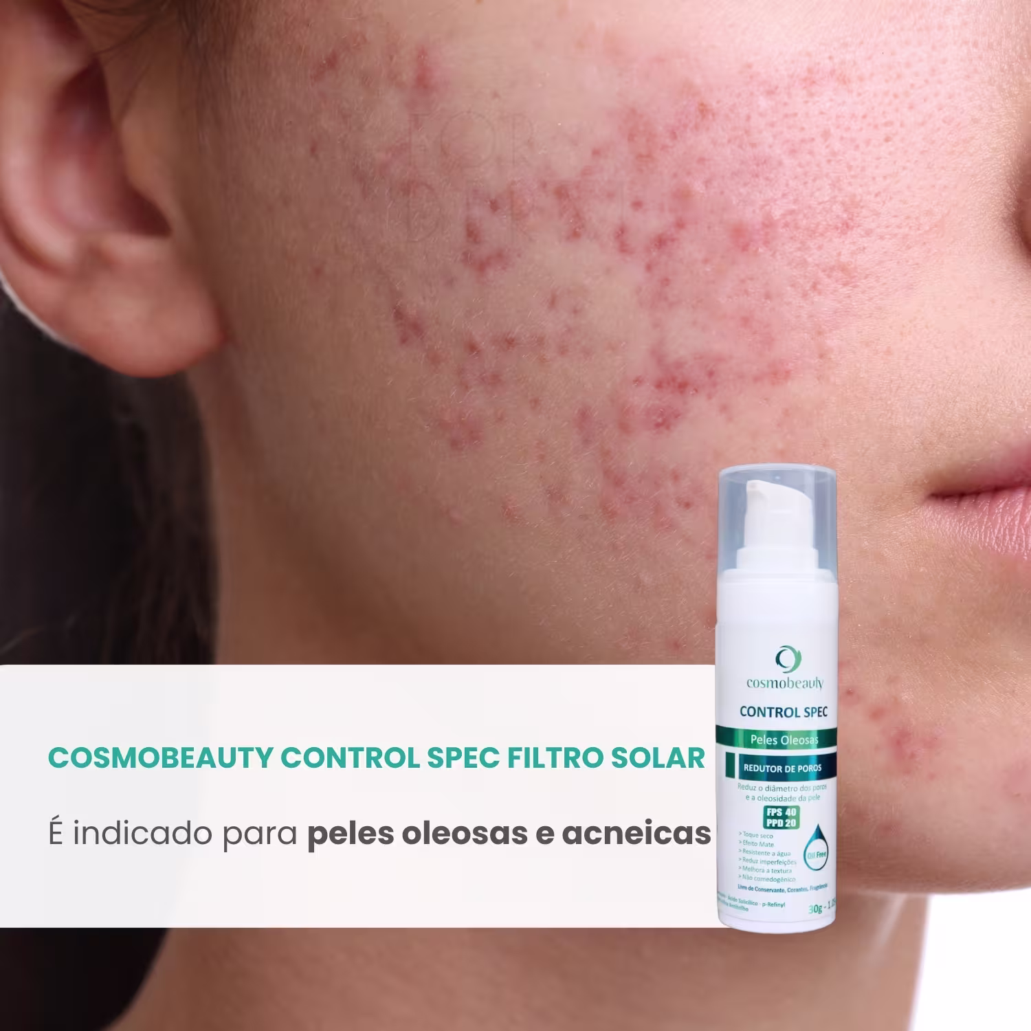 O Filtro Solar Redutor de Poros Cosmobeauty Control Spec FPS 40 PPD20 é um protetor solar facial desenvolvido especialmente para peles oleosas e com poros dilatados. Sua fórmula inovadora atua não apenas na proteção contra os danos causados pela radiação solar, mas também no controle da oleosidade e na redução da aparência dos poros dilatados, proporcionando uma pele com aspecto matificado e uniforme. Com textura leve e não oleosa, o produto se espalha facilmente e é rapidamente absorvido, sem deixar resíduos ou sensação pegajosa.