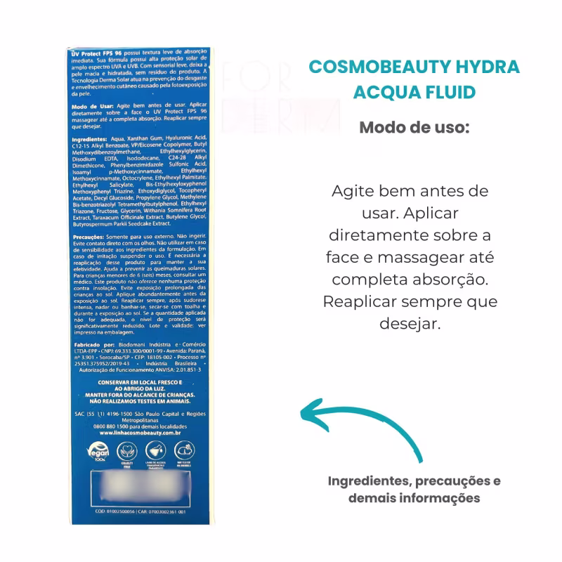 Não sei o CEPProtetor solar fluído. Cosmobeauty Cosmoblock Hydra Acqua FPS 96 possui amplo espectro com alta proteção contra raios UVA, UVB, IV e luz visível, além de proteção térmica.
