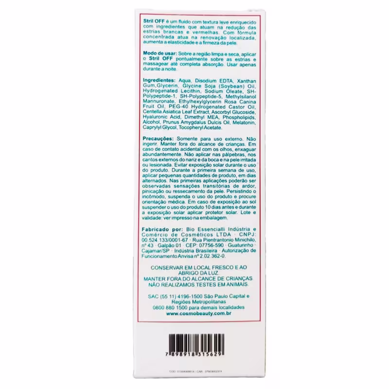 Fluido concentrado para estrias. Cosmobeauty Stril Off Home Care é um reparador intensivo pontua para a minimização de estrias brancas e vermelhas.