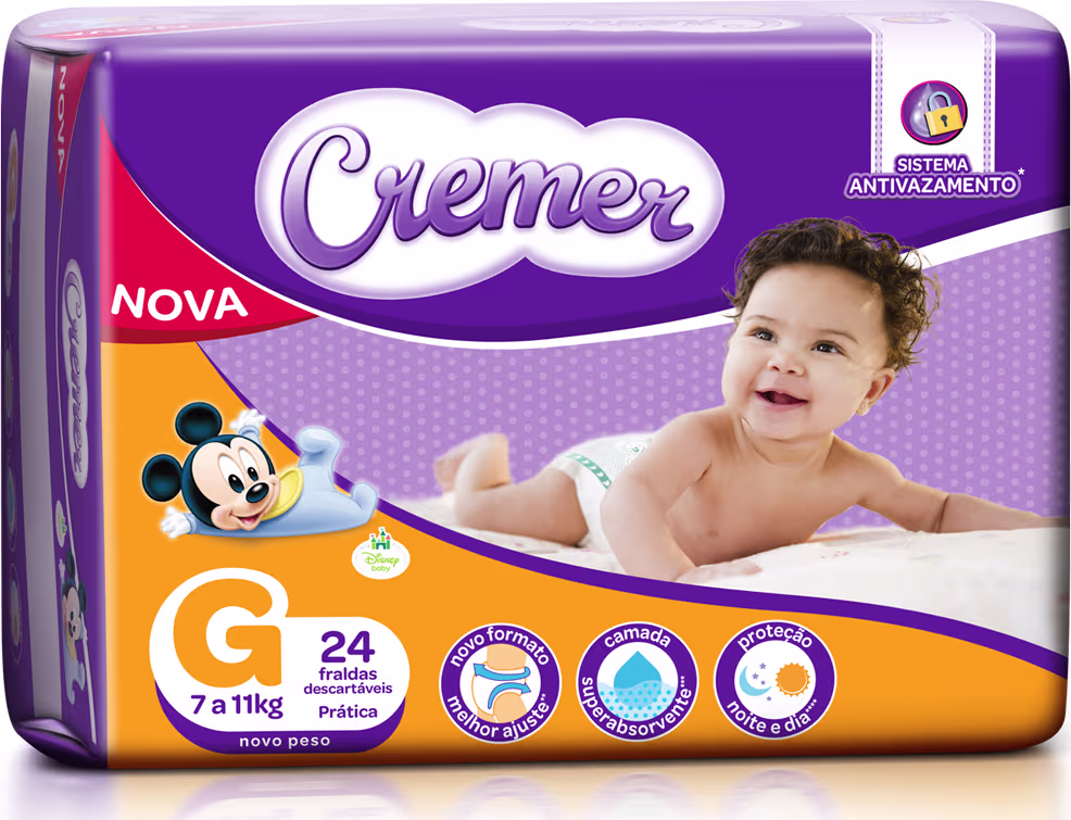 A Fralda Descartável Cremer Antivazamento é ideal para noites tranquilas e dias mágicos, ainda mais confortáveis. Conta com um novo sistema antivazamento, composto por uma nova fita abre e fecha mais flexível e orelhas maiores que se ajustam ao corpinho do bebê, e uma camada super absorvente que distribui rápido o xixi pela fralda e evita o retorno do líquido, garantindo que a pele do fique bem sequinha. A fralda tem uma linda estampa com o Mickey ou Minnie.