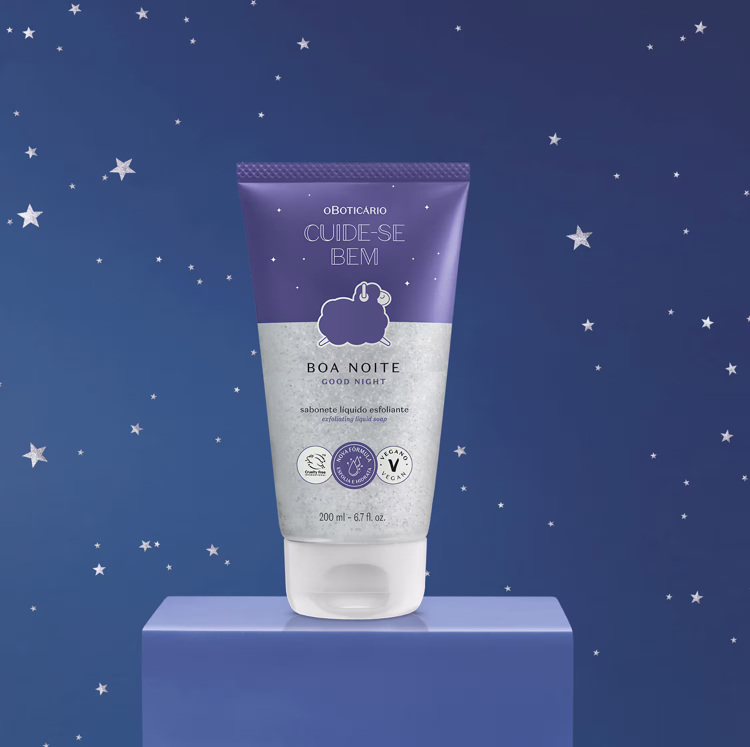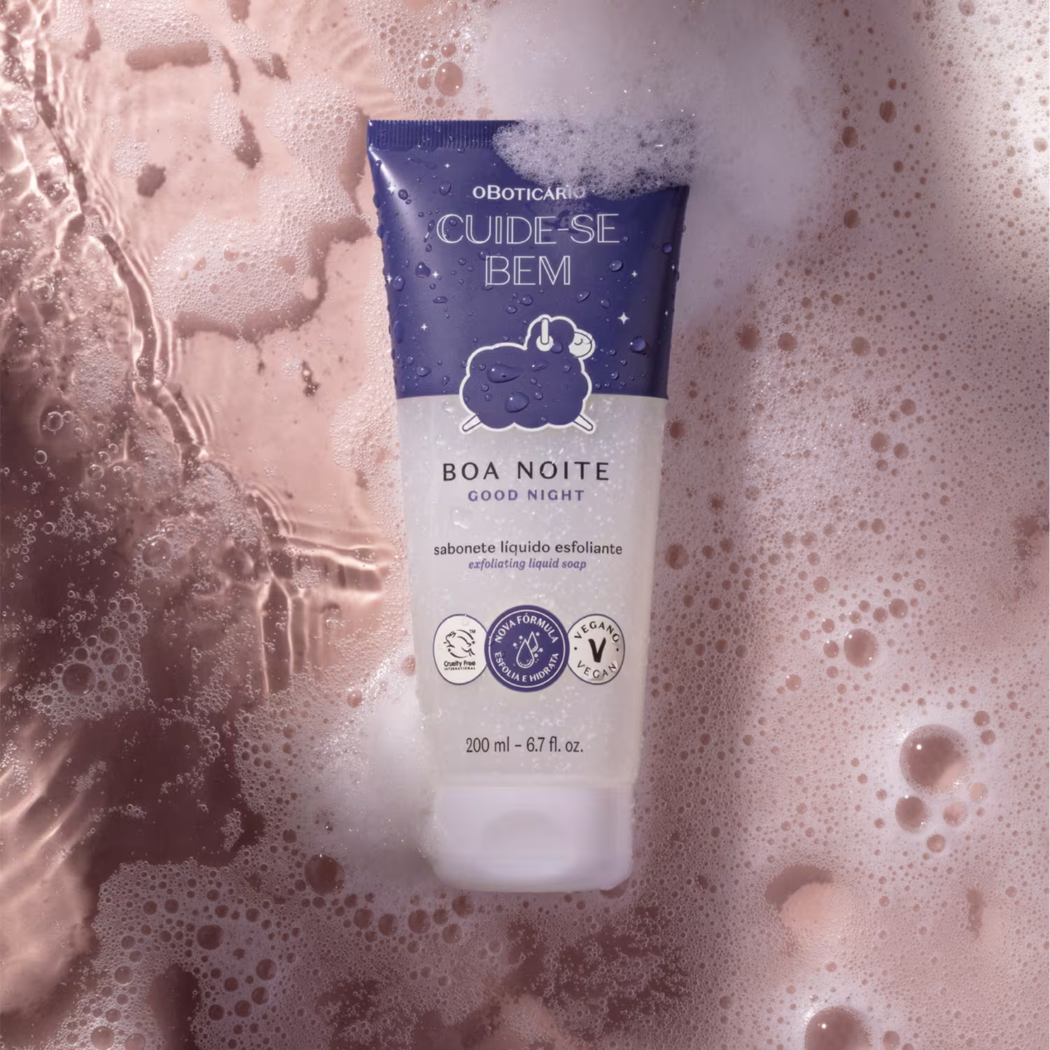 Sabonete líquido esfoliante. Com fragrância floral musk, Cuide-se Bem Boa Noite o Boticário esfolia, renova e hidrata a pele, além de proporcionar sensação de bem-estar para um boa noite de sono.