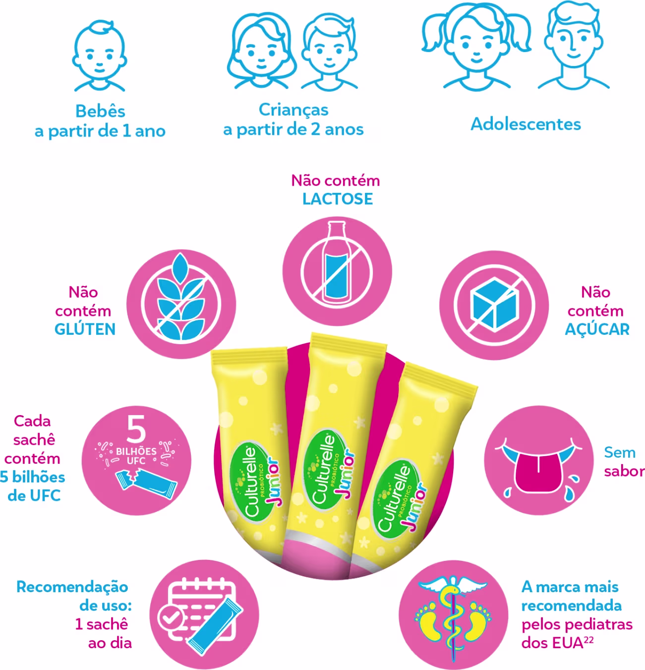O Probiótico Culturelle Junior é recomendado para crianças a partir de 1 ano. Trata-se do produto de uso diário mais recomendado por pediatras nos Estados Unidos, com 5 bilhões de culturas ativas de LGG, responsáveis por auxiliar na manutenção e no equilíbrio da microbiota. O resultado? Muito mais saúde e bem-estar para os pequenos.