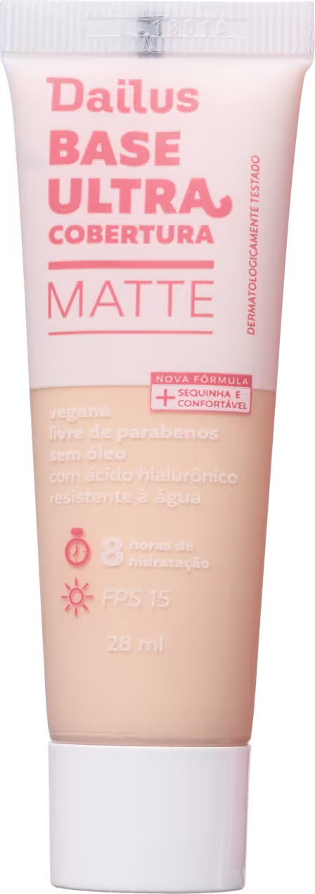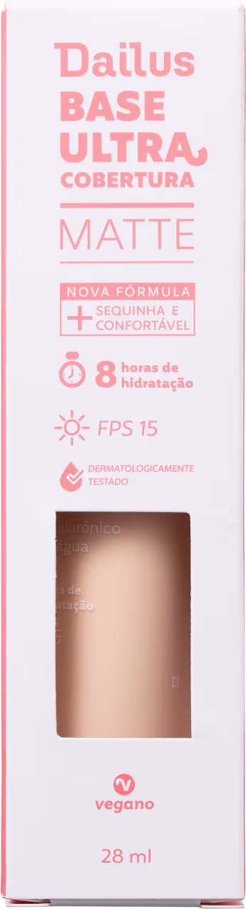A Base Líquida Dailus Ultra Cobertura Matte possui ácido hialurônico, que garante até 8h de hidratação, além de FPS 15 que protege a pele dos raios ultravioleta (UVA) e uma fórmula 100% vegana, livre de parabenos e óleos. Perfeita para o dia a dia, é resistente à água e ao suor, apresenta alta performance e não transfere ou craquela. Disponível em 12 tons.