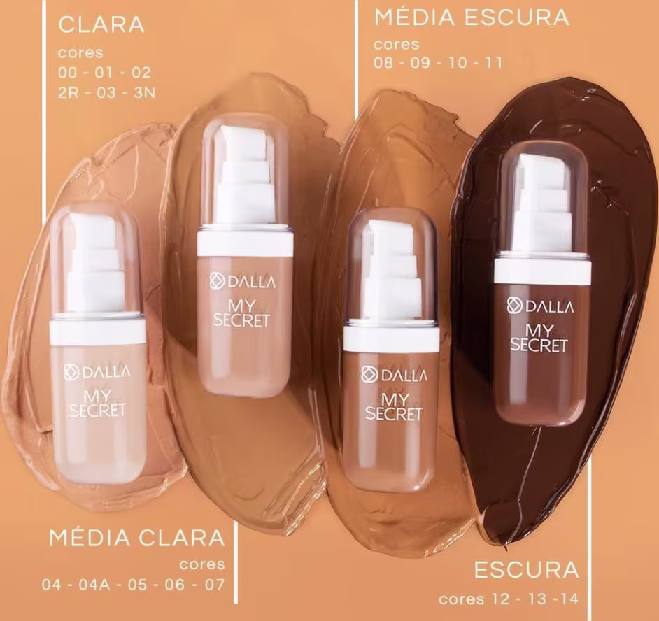 Base Líquida Dalla Makeup My Secret, com alta cobertura, efeito matte e resistente a água e ao suor. Melhores bases de Dalla Makeup na BLZ. Ver mais ❯