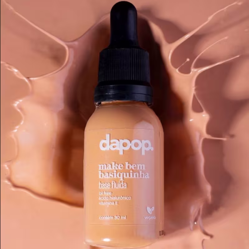 Base líquida com acabamento natural. Dapop Make Bem Basiquinha textura fluida para quem prefere um efeito mais leve e natural na hora da preparação de pele.