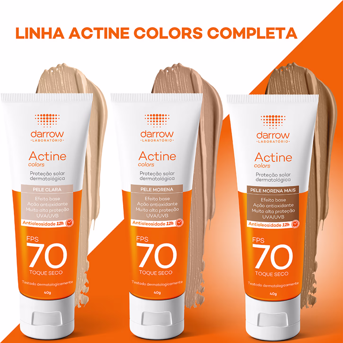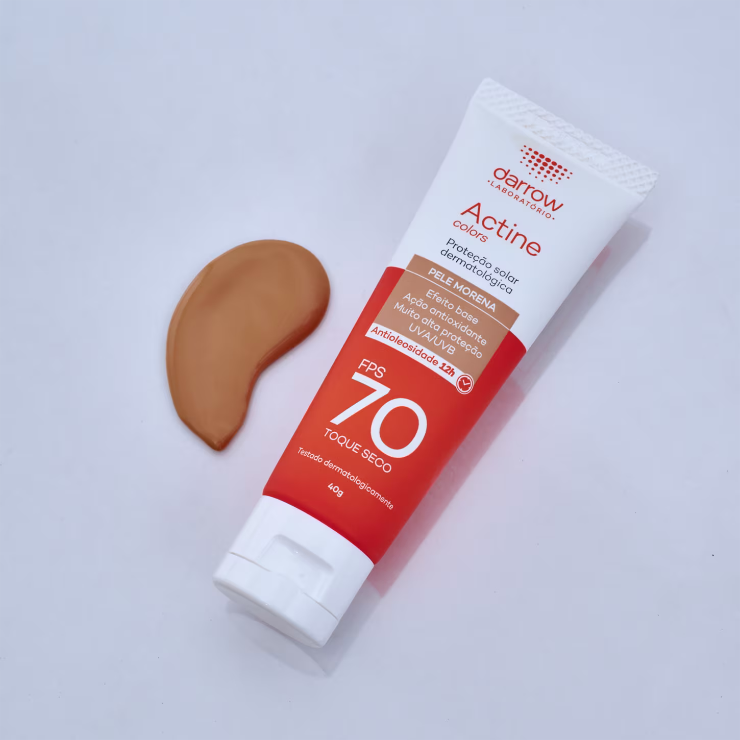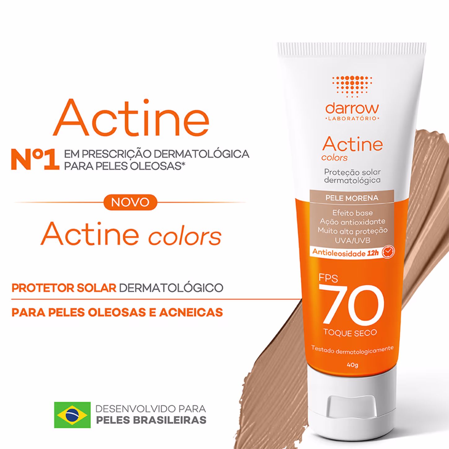 Filtro solar facial com cor. Darrow Actine Colors FPS70 conta com toque seco e efeito uniformizador: ideal para peles oleosas e acneicas.