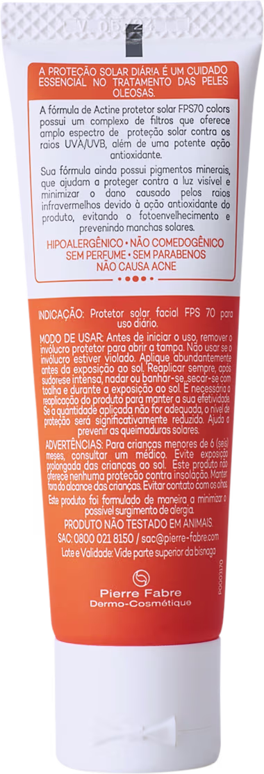Protetor Solar Darrow Actine Colors FPS70 possui ação antioxidante e garante alta proteção contra os raios UVA e UVB. O produto faz parte do segmento Actine: a linha mais prescrita pelos dermatologistas brasileiros e expert em oferecer o melhor tratamento antioleosidade e antiacne. Apresenta fórmula com ativos seborreguladores, como Vitamina E e Sílica, além de pigmentos minerais, que previnem contra os efeitos da luz visível e minimizam os danos causados pelos raios infravermelhos. Ideal para manter sua pele livre de manchas, acne, brilho excessivo e envelhecimento precoce.