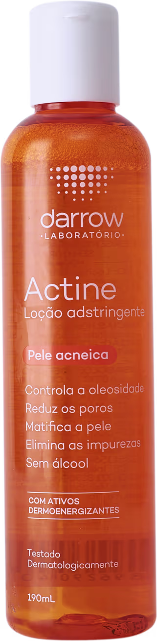 Loção adstringente para pele oleosa e com acne. Darrow Actine finaliza a limpeza da pele com a remoção da oleosidade retida nos poros e o controle do brilho sem deixar o rosto ressecado.