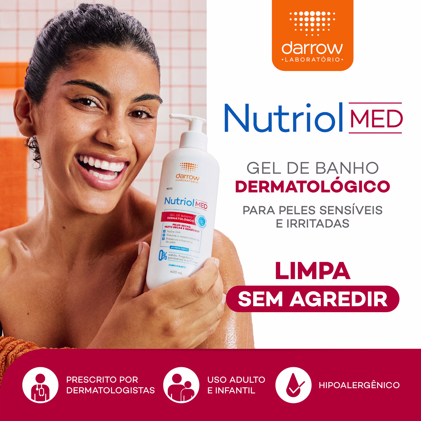 Gel de banho. Darrow Nutriol MED possui espuma cremosa que hidrata, limpa sem agredir e prolonga a hidratação após o banho.
