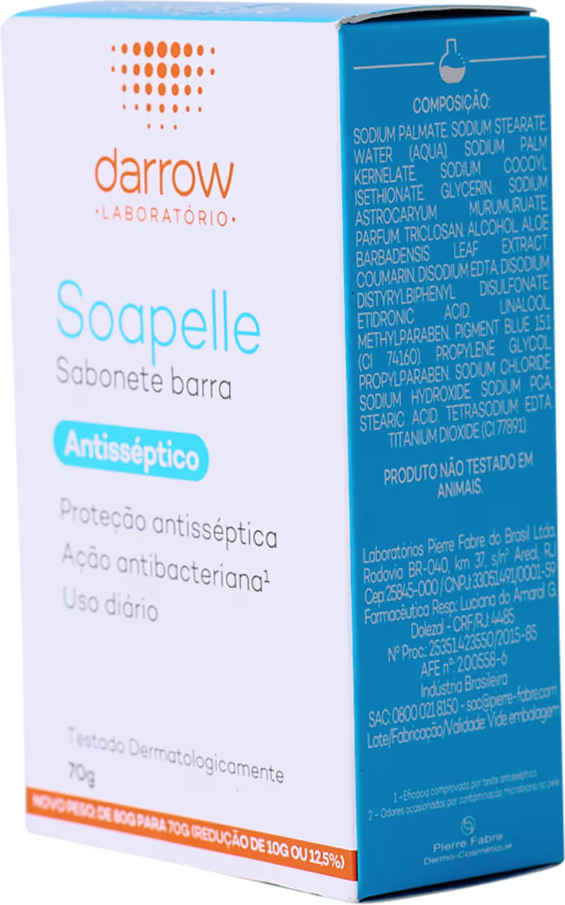 O Sabonete em Barra Darrow Soapelle é um poderoso antibacteriano, que auxilia na higiene diária e na prevenção contra infecções. Possui eficácia comprovada contra fungos, bactérias e vírus, fazendo uma limpeza antisséptica eficaz e protegendo contra agressores externos. Conta ainda com ação hidratante e fortificadora da barreira cutânea, já que a fórmula combina Extrato de Murumuru e Aloe Vera.